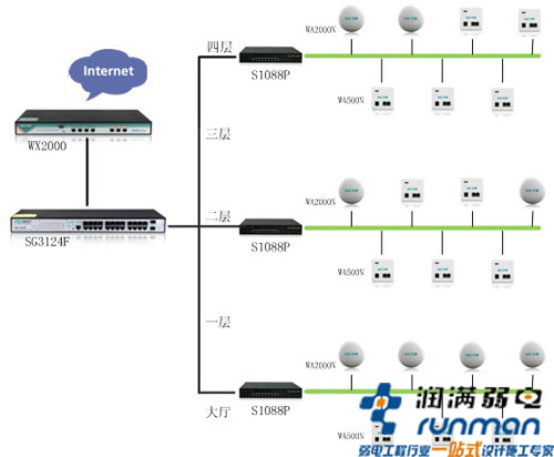 我們通過在整個(gè)樓部署一定數(shù)量的WA200ON以及WA500N無線AP,來覆蓋整個(gè)樓層無線電微波,從而滿足樓層的整個(gè)PC的無線接入;樓層的所有無線AP通過超五類雙絞線,以百兆帶寬接入到樓層的POE交換機(jī)中,再通過匯聚層交換機(jī)實(shí)現(xiàn)二層核心交換機(jī),最后通過無線控制器實(shí)現(xiàn)對外部網(wǎng)絡(luò)的訪問。